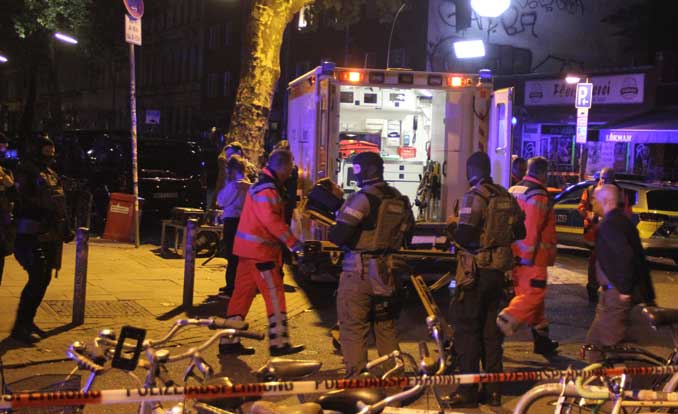 Zwei Rettungswagen, mehrere Streifenwagen und mittendrin zahlreiche schwerbewaffnete SEK-Beamte stehen auf der Bartelstraße im Hamburger Schanzenviertel. Die Dreharbeiten gingen bis tief in die Nacht. Foto: FoTe Press