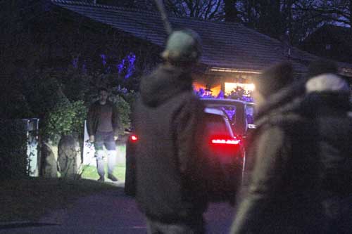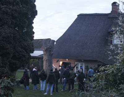Aber gegen 20.30 Uhr, mit Einbruch der Dämmerung, tut sich was. Im Garten baut das Filmteam von „Nord Nord Mord“ mehrere Stative auf. Ein Stativ ist für eine Filmkamera gedacht, die anderen für Beleuchtung. Mehrere Komparsen in weißen Schutzanzügen mit schwarzer Aufschrift „Polizei“ laufen im Garten herum. Sie scheinen etwas zu suchen – offenbar spielen die Männer die Spurensicherung. Nun ist auch ein bekannter Schauspieler der ZDF-Krimiserie zu sehen: Oliver Wnuk. Der 50-jährige Darsteller verkörpert seit 2010 in der Fernsehserie den Kriminaloberkommissar Hinnerk Feldmann. „Wir machen bitte eine Probe“, sagt ein Crew-Mitglied. Dann wird die zu drehende Szene geprobt. Unterdessen stehen mehrere Schaulustige am Gartenzaun und schauen sich die Proben an.