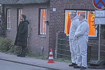 Diese Szene wird mehrere Male gedreht, bis Regisseur Berno Kürten zufrieden ist. Dann heißt es: „Wir sind mit dem ersten Teil des Bildes 49 durch. Wir ziehen auf die Straße!“ Auf der Straße Im Ort parkt ein Fahrzeug der Spurensicherung, der Kofferraum ist geöffnet. Direkt vor dem Reetdachhaus an der Niederstraße wird ein Filmstreifenwagen fernsehgerecht drapiert. Die Straße wird für die Filmarbeiten – behördlich abgestimmt – kurzzeitig abgsperrt. Nun kommen immer mehr Schaulustige ans Filmset. Fernsehkameras, Blaulicht und viele Komparsen in Polizeiuniform locken nunmal Menschen an. Das Filmteam nimmt es gelassen. Dann wird auch schon geprobt, danach gedreht. Die Szene selbst ist völlig belanglos und langweilig: Oliver Wnuk fährt als Kriminaloberkommissar Hinnerk Feldmann mit