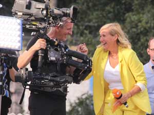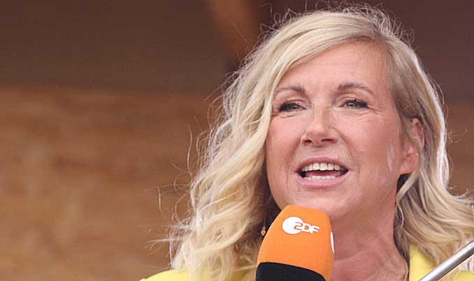 TV-Moderatorin Andrea Kiewel moderiert den „Fernsehgarten On Tour“ von den Landungsbrücken in Hamburg. Foto: FoTe Press