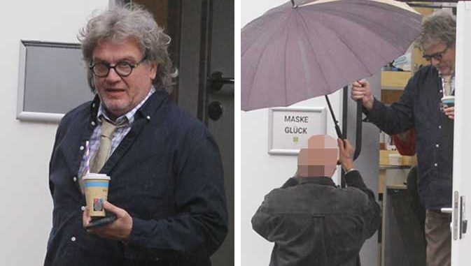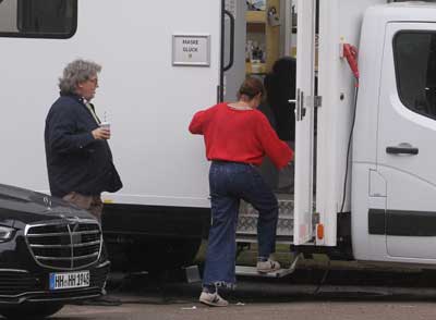 Natürlich respektieren wir die Privatsphäre der Schauspieler. So machen wir beispielsweise keine Fotos, wenn die Filmcrew samt Schauspieler ihr Mittagessen einnimmt. Auch machen wir keine Fotos von der Ankunft oder Abfahrt an den jeweiligen Hotels, in denen die Darsteller während der Filmarbeiten untergebracht sind. Das versteht sich von selbst. Wir haben Hape Kerkeling erwischt, wie er sein Aufenthaltsmobil verlässt und in ein benachbartes Maskenmobil steigt. Das gehört zur Berichterstattung von Filmarbeiten dazu. Hape Kerkeling wurde dabei im blauen Hemd und mit einem Coffee to go – stilecht mit Strohhalm – gesichtet. Er schien gut gelaunt und wechselte Worte mit mehreren Crew-Mitgliedern.