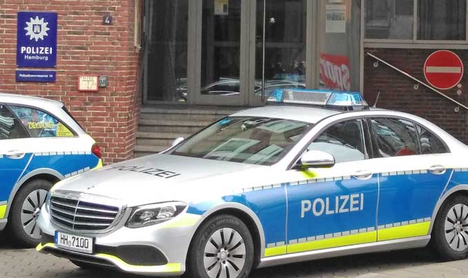 Ein Funkstreifenwagen der Hamburger Polizei steht vor einem Polizeikommissariat. Symbolfoto: FoTe Press