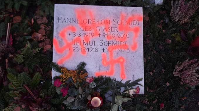 (mr). Wer macht sowas? Am heutigen Sonntag wurden auf der Grabplatte des ehemaligen Bundeskanzlers Helmut Schmidt und seiner Frau Loki mehrere Hakenkreuze entdeckt. Unbekannte schändeten das Ehrengrab auf dem Friedhof Ohlsdorf mit vier dieser verbotenen Symbole aus dem Nationalsozialismus.