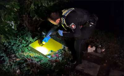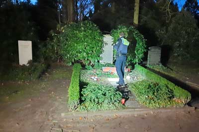 Gegen 16 Uhr wurden die widerlichen Schmierereien auf der Grabplatte des Paares gesehen. Die Nazi-Symbole wurden über die Namen und die Lebensdaten der Verstorbenen gesprüht. Etwa um 17.20 Uhr fuhr ein Streifenwagen des Polizeikommissariats 36 vor; eine Beamtin und ein Beamter sicherten vor Ort Spuren und machten Beweisfotos. Danach übermalte der Beamter die verbotenen Hakenkreuze mit einem Kreide-Spray. Die beiden Polizisten gingen mit einer Taschenlampe auf Spurensuche und suchten in der Nähe befindliche Grabsteine, ob auch diese beschmiert wurden: Fehlanzeige! Offenbar galten die Schmierereien dem Altkanzler.