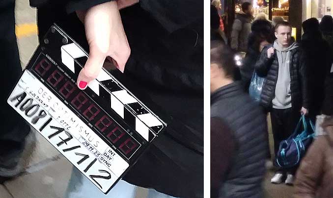 Auf dem Foto links ist die Filmklappe von „Der Optimismus“ zu sehen, rechts steht ein junger Mann mit einer Sporttasche und einem Müllsack am Eingang des Hauptbahnhofs. Fotos: FoTe Press
