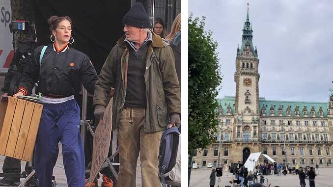 Beim Demonstranten handelt es sich um Schauspieler Hans Uwe Bauer („Tatort“, „Polizeiruf 110“, „Sarah Kohr“), bei der Frau um die bekannte Darstellerin Anne Schäfer („Der Barcelona-Krimi“) . Beide stehen aktuell für das Projekt „Liebe & Anarchie“ vor der TV-Kamera, das in Hamburg gedreht wird. Das Original der Serie ging bereits vor fünf Jahren unter dem Namen „Love & Anarchy“ an den Start und war bei Netflix zu sehen. Zwei Staffeln sind seit 2020 erschienen – nun wird offenbar eine deutsche Version produziert. Wir trafen die Fimcrew heute auf dem Rathausmarkt, auf dem sie bis etwa 10 Uhr gedreht haben.