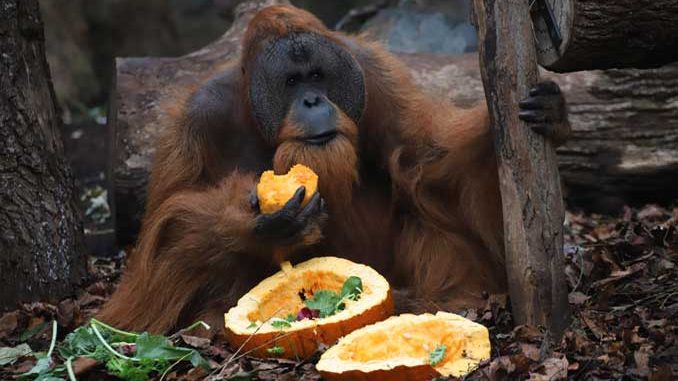 Orangeleuchtende Kürbisse lugten aus den Nebelschwaden im Orang-Haus hervor. Die neugierigen, tierischen Bewohner machten sich sofort daran die extra für sie bereitgestellten Leckereien zu entdecken und zu verspeisen. „Einen ganzen Kürbis bekommen unsere Orang-Utans nur ganz selten, das ist etwas Besonderes. Bei Hagenbeck wird im Rahmen der modernen Zootierhaltung sehr viel Wert auf Programme zur Tierbeschäftigung gelegt. Das ist ein wichtiger Teil für artgerechte Haltung.“ erklärt die stellvertretende Reviertierpflegerin Chandra Kummerfeldt.