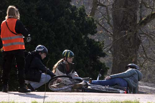 Zwei "Pfefferkörner" beugen sichzu einer am Boden liegenden Fahrradfahrerin und helfen ihr. Ein Kameramann filmt sie dabei. Foto: FoTe Press