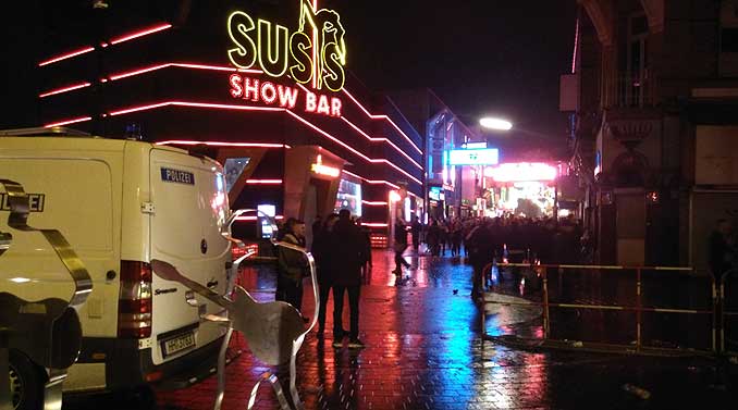Die Große Freiheit auf St. Pauli. Die Polizei ist jedes Jahr mit einem Großaufgebot vertreten. Beide Eingänge werden durch die Polizei mit Videolameras beobachtet. Links im Bild ein so genannter Beweis- und Dokumentationskraftwagen der Polizei (BeDoKw). Foto: FoTe Press/Schmidt