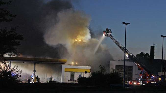 (mr). An einer Shell-Tankstelle am Hammer Deich im Stadtteil Hammerbrook kam es am Abend gegen 21.20 Uhr zu einem Feuer. Ein riesige schwarze Rauchwolke war am Himmel zu sehen, zahlreiche Passanten riefen daraufhin die Feuerwehr. Beim Eintreffen des ersten Löschzuges wurde der Alarm sofort auf Feuer 2 und danach auf Feuer 3 (Feuer mit drei Löschzügen) hochgestuft. Der Verkaufsraum und eine angrenzende Waschhalle standen in Flammen. Mit schwerem Atemschutzgerät gingen mehrere Feuerwehrleute in die Gebäudeteile. Unterdessen wurden drei Leiterwagen aufgestellt und ausgefahren, von denen Feuerwehrkräfte ebenfalls das Feuer bekämpften.