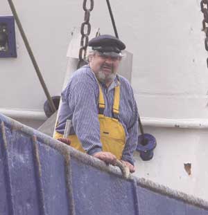 Fischer spielt und auf einem Fischkutter arbeitet.