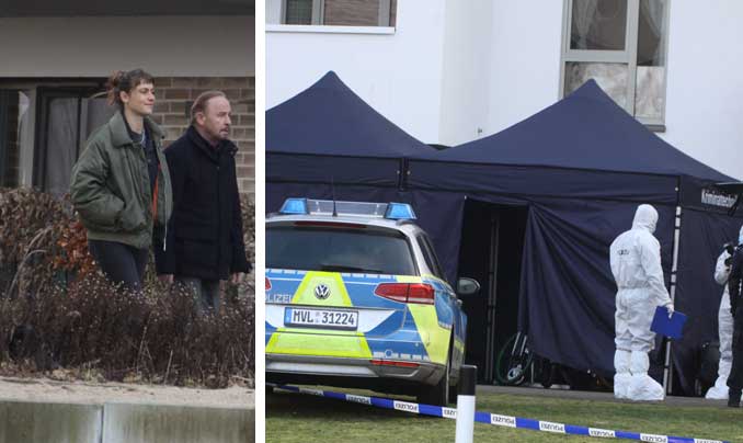 Das Filmset von „Stralsund“ in einem Innenhof in der Wohnsiedlung Am Schilfpark“. Foto: FoTe Press/Röhe
