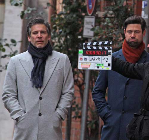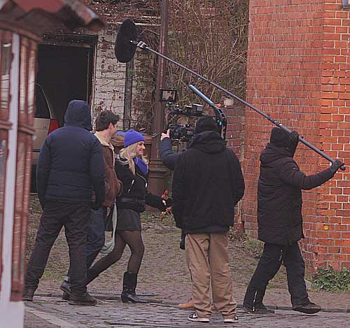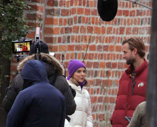 Straße entlang und werden vom „Rote Rosen“-Filmteam