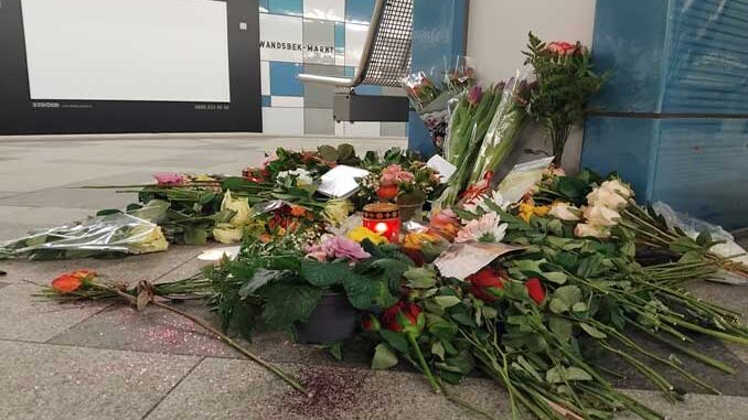 Mehrere Blumen, Kerzen und Kerzen liegen auf dem BAhnsteig am Wandsbek-Markt. Foto: FoTe Press