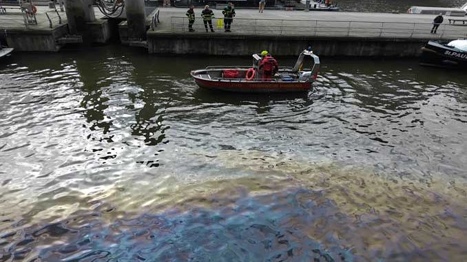 Offenbar wurde auch eine Ölsperre errichtet, damit der Ölfilm sich nicht weiter ausbreitet. Etwa eine halbe Stunde dauerte der Einsatz. Die Polizei ermittelt aktuell die Ursache der Ölverschmutzung.
