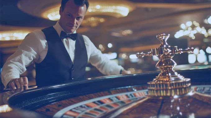 Ein geschulter Croupier steht an einem Roulettetisch. Die Geschichte des Roulettes und sein Weg zum Online-Demo. Symbolfoto: ha