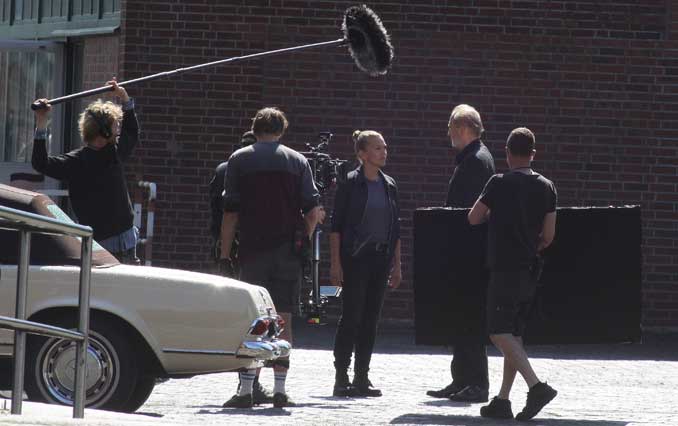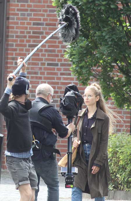 Das Filmset von „Helen Dorn“ am 10. August 2021 auf dem Betriebsgelände des Zolls und der Berufsfachschule der Feuerwehr Hamburg. Anna Loos und Peter Lohmeyer unterhalten sich. Foto: FoTe Press