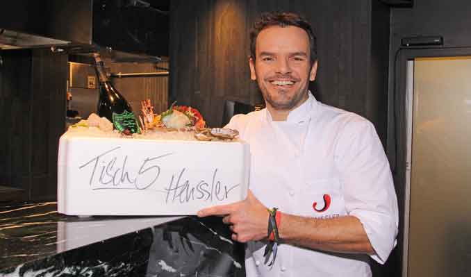 Steffen Henssler (46) in seinem neuen Restaurant „Henssler Go“. Auf dem Foto zu sehen ist eine Fischkiste mit frischen Austern und Champagner. Die Kiste trägt die Aufschrift „Tisch 5“. Foto: Röhe