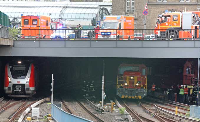 Der verunglückte Bauzug (rechts) steht unter der Brücke der Ernst-Merck-Straße. Nach Angaben eines Bahnsprechers war der Aufbau des Zuges, eine Art Container, aus unbekannten Gründen in Schieflage geraten, verrutscht und mit einem Brückenpfeiler kollidiert. Foto: FoTe Press/Röhe