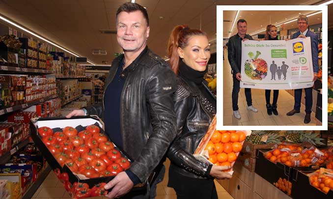 Rühren für den Weltdiabetestag die Werbetrommel: Fußball-Profi Thomas Helmer und Schauspielerin Yasmina Filali. Das kleine Foto rechts zeigt das Ehepaar zusammen mit Jens Kröger, Vorstandsvorsitzender diabetesDE – Deutsche Diabetes-Hilfe. Foto: Röhe